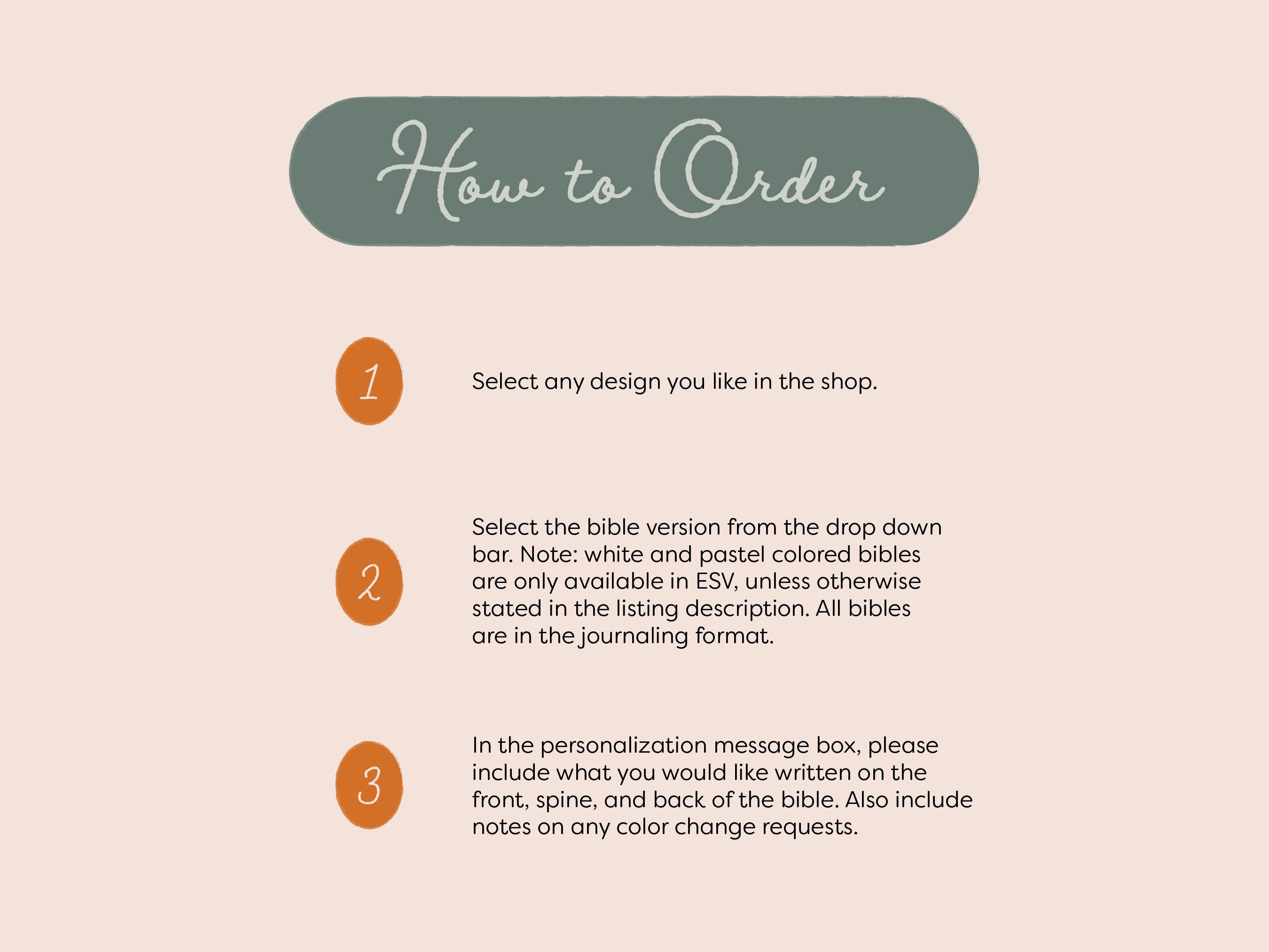 **All BIBLES ARE PAINTED CUSTOM UPON ORDER. THE ESTIMATED SHIP TIME IS SHOWN ONCE YOU ADD YOUR ITEM TO THE CART. IF YOU NEED YOUR ITEM SOONER PLEASE MESSAGE ME TO CHECK ON RUSH ORDER AVAILABILITY. RUSH ORDERS HAVE A $35 ADDED FEE AND HAVE LIMITED AVAILABILITY.