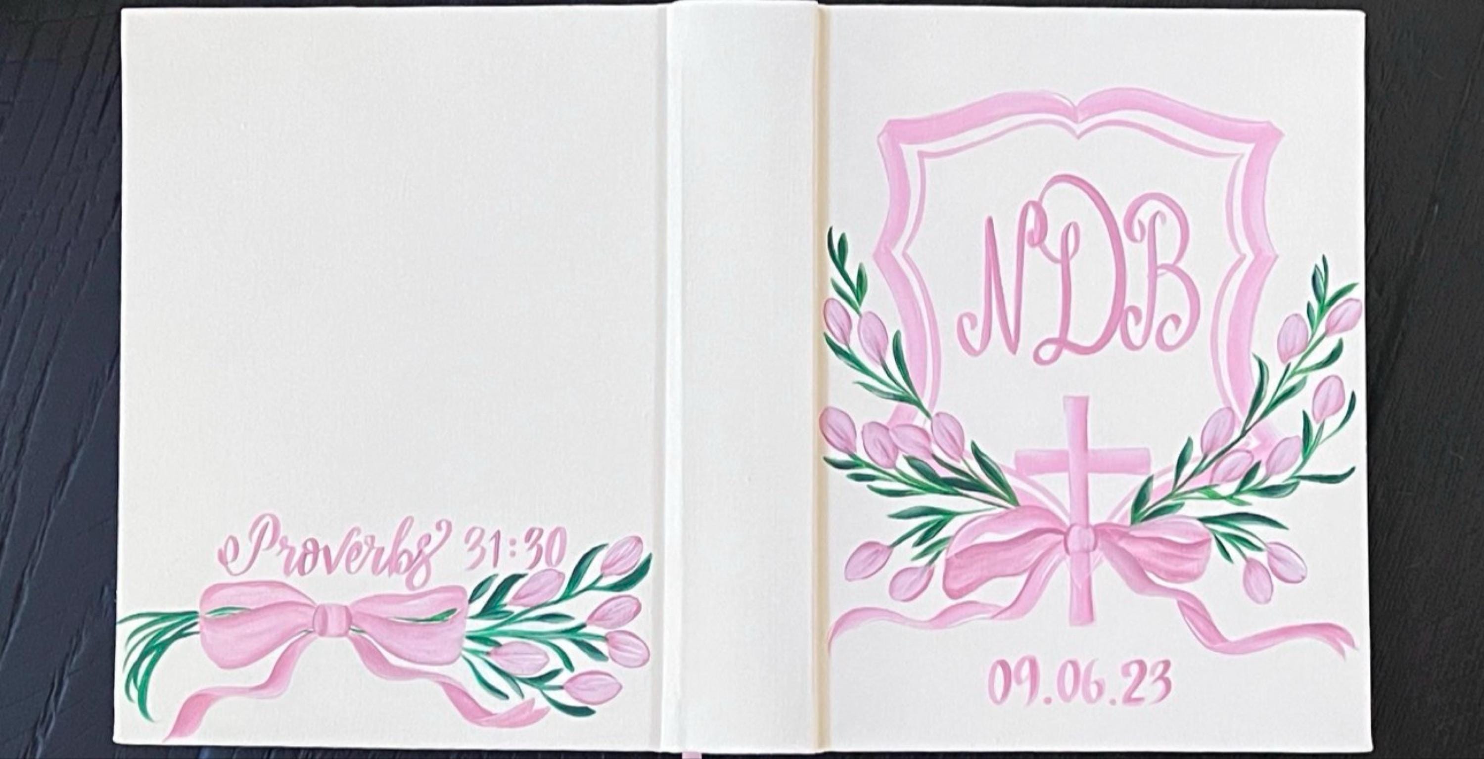 I sent a custom logo and the shop owner was able to paint it onto the new Bible. It’s such a special gift and I’m grateful that God blessed this artist with such an amazing talent! Thanks so much!