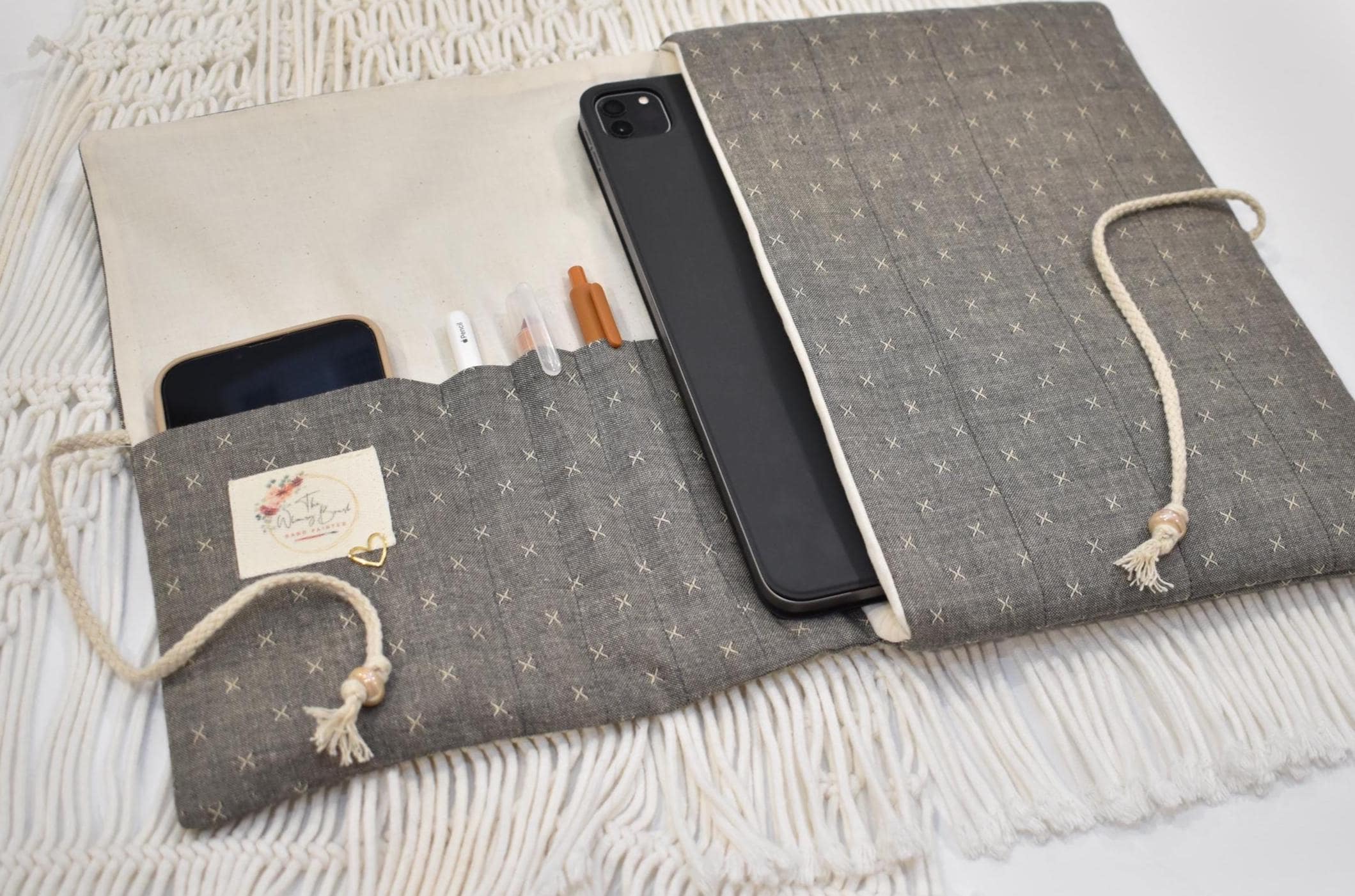 Enjoy a stylish hand sewn quilted clutch bag to help carry and protect your custom painted Bible! The Whimsy Brush Bible bag is made custom in a rich organic linen. Fully lined with natural unbleached muslin, cotton tie closure with hand made ceramic beads. Inside cover has cell phone pocket, three pen pockets, a ruler pocket. Finishing touch with embellished label & gold heart.