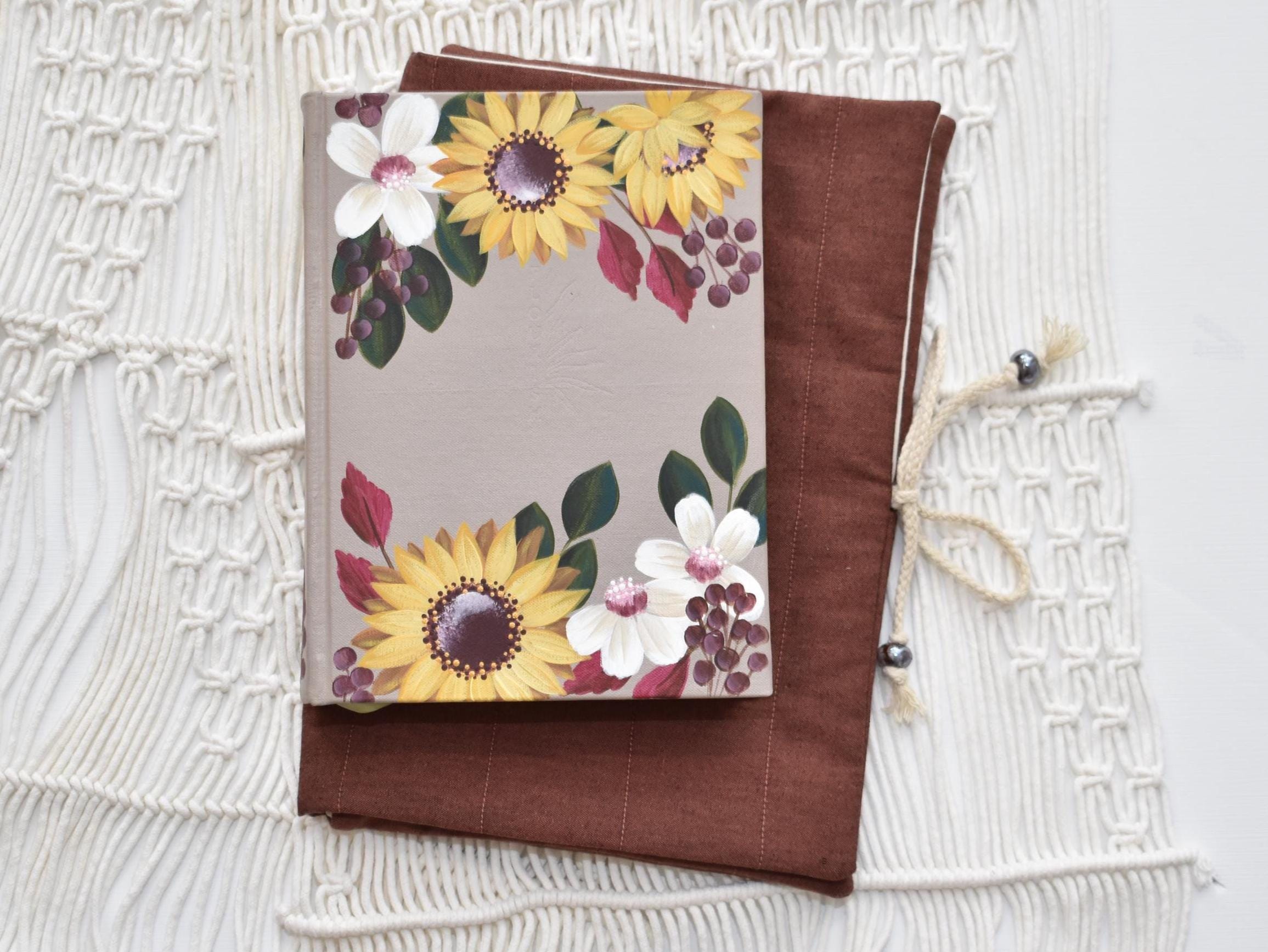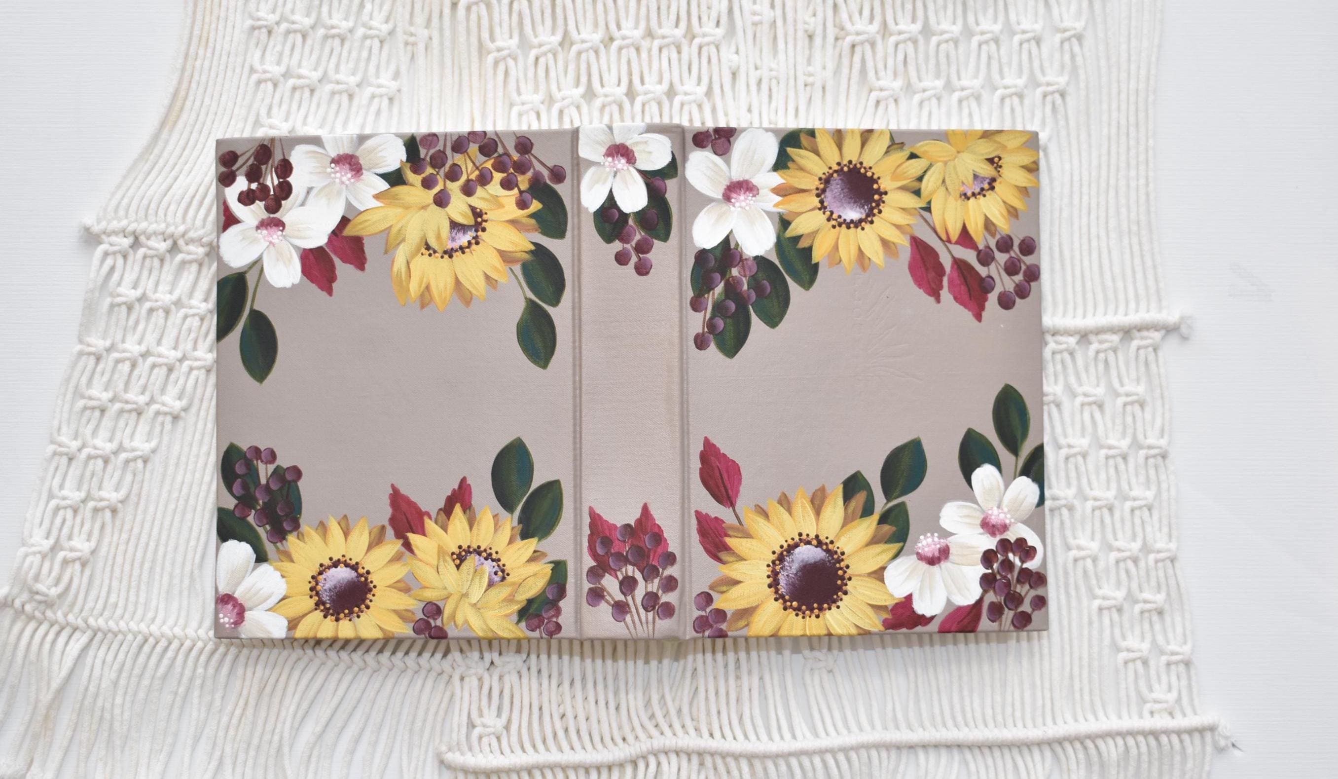 **Bible example shown is based in a Mushroom shade with florals added in shades of shades of rust, yellows, dark maroon/purples and soft pink. Foliage added in shades dark pine green and rust red brown. Lettering recommended, Dark Metallic gold or white.
