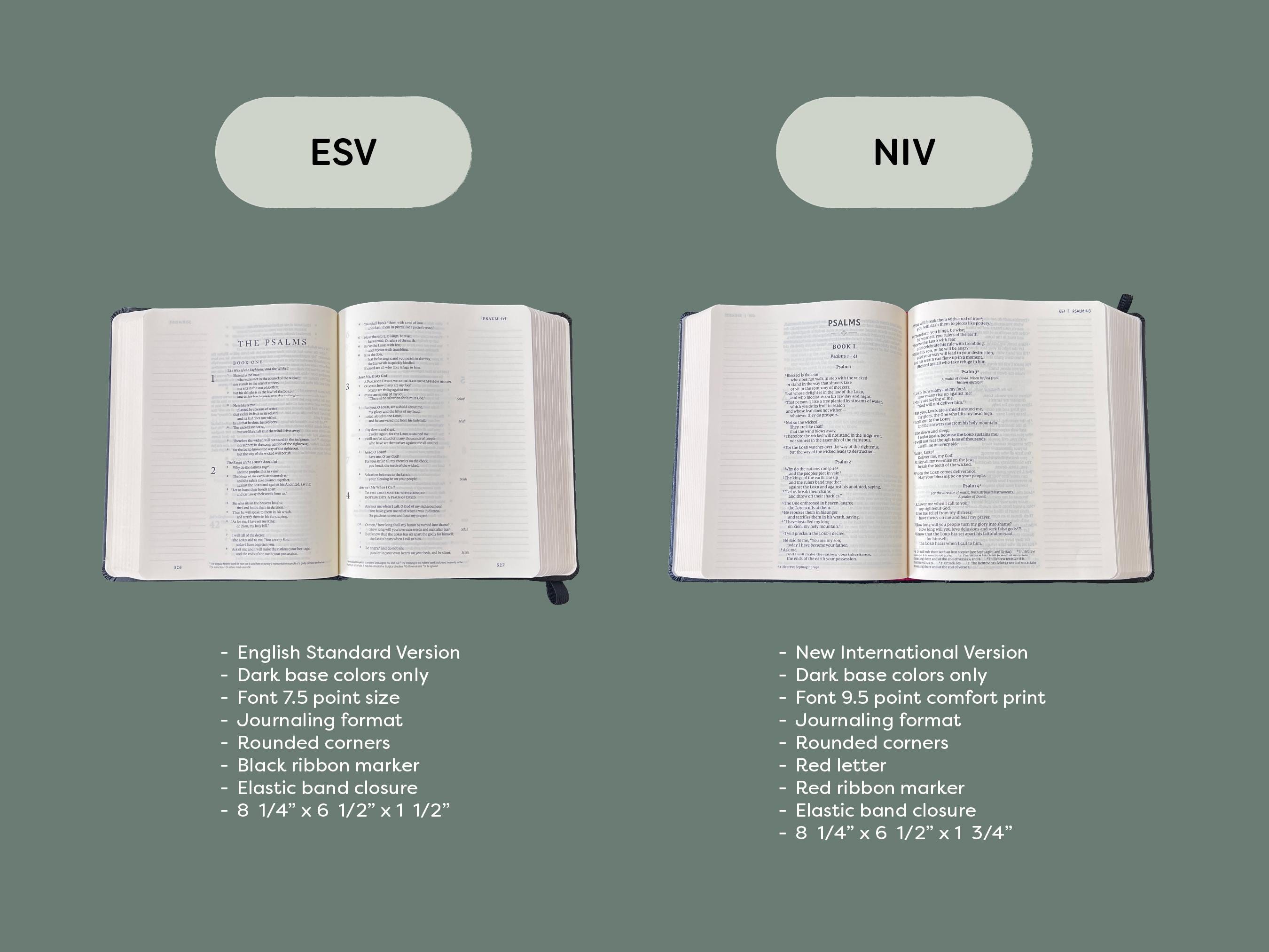 *ESV Journaling (light base color designs only) 6.25 W x 8.25 T x 1.5" **