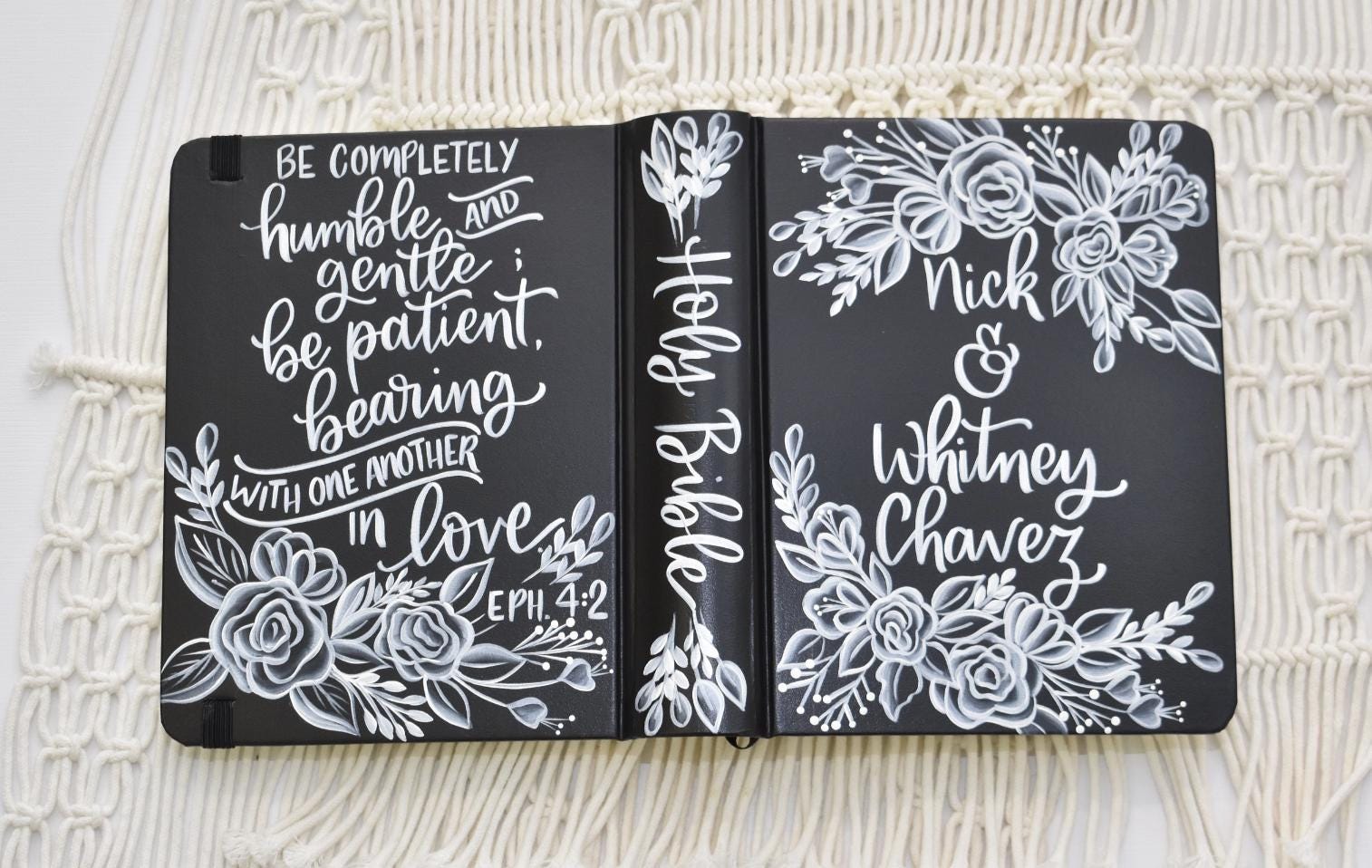 This design is based in black with white florals and lettering. Limited space for lettering, Holy Bible plus a name is recommended. Design color can be customized. Base color options are shown in listing photos.
